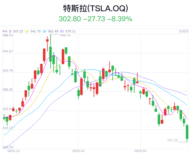 这一惊人数据令特斯拉隔夜股价一度跌超10%,股价一度跌破300美元。截至收盘,该股收跌约8.39%,收于302.80美元。