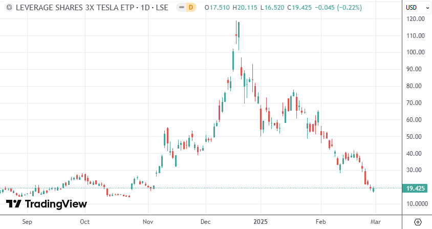 周五(2月28日)美股早盘,特斯拉股价一度跌至273.6美元,较2024年12月的高位累跌近44%。与此同时,TSL3也较其去年12月的峰值下跌超过80%。