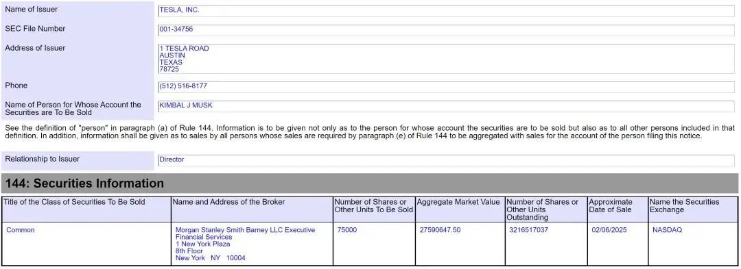 据特斯拉递交给SEC的文件显示,特斯拉董事Kimbal Musk(金博尔·马斯克)在2025年2月6日出售了75000股特斯拉股票,价值2759万美元(约2亿元人民币)。