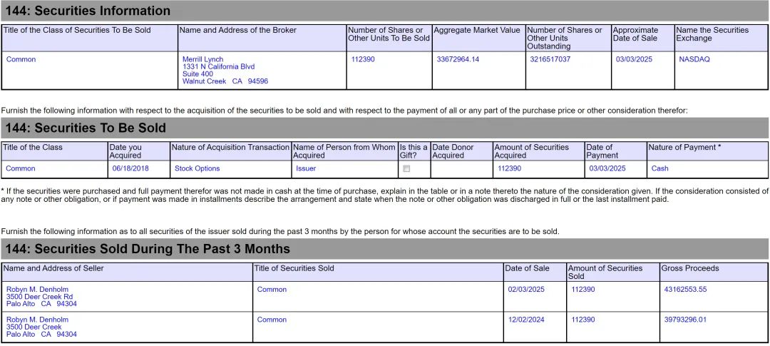 Robyn Denholm在2025年3月2日减持112390股,套现4316.2553万美元。Robyn Denholm还在2024年12月2日减持112390股,套现3979.3296万美元。