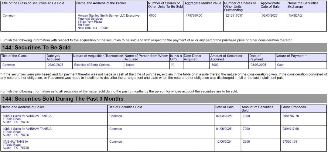 特斯拉CFO Vaibhav Taneja也在2025年3月3日减持6000股,套现175.788万美元。Vaibhav Taneja还在2024年12月6日减持2606股,套现97.52万美元;在2025年6月1日减持7000股,套现289.49万美元;在2025年2月3日出售7000股,套现283万美元。