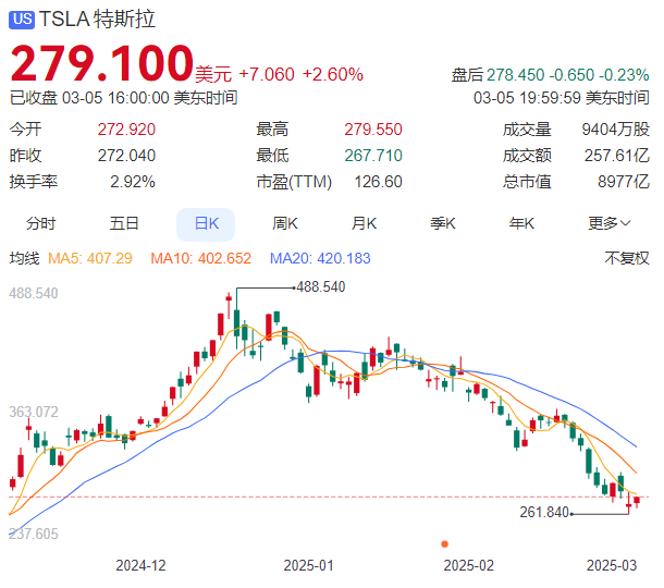 据此前报道,美国当地时间3月4日,特斯拉股价跌4.43%,报272.04美元,市值一夜蒸发406亿美元(约合人民币2950亿元)。2025年初至今,特斯拉股价从最高超过420美元已累计下跌超35%。