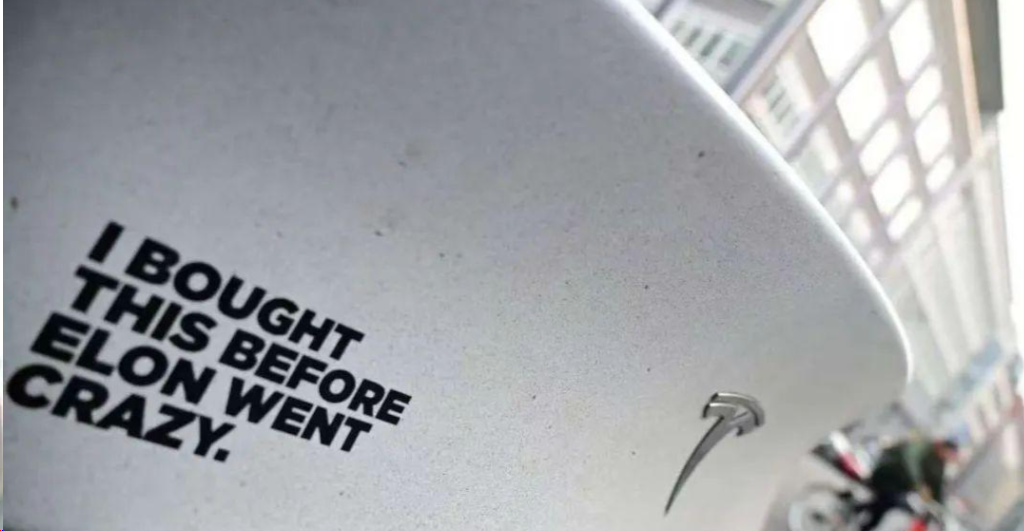 以致于,部分车主不得不在车尾贴上“我在他发疯前买了这辆车”的贴纸,试图与马斯克划清界限。