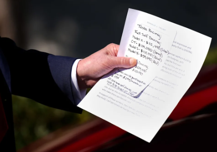 周二白宫活动的一张照片捕捉到,美国总统特朗普正拿着关于几辆特斯拉的价格清单在一起。