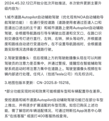 本版本更新包括了城市道路Autopilot自动辅助驾驶、驾驶室摄像头和地图包版本更新CN-2025.8-15218三项主要更新。
