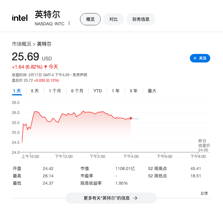 受此消息推动,英特尔股价周一收涨超过6.8%,报25.69美元。