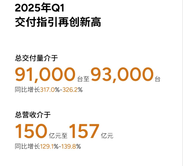 对于2025年第一季度,小鹏汽车预期汽车交付量91000辆至93000辆,按年增加约317.0%至326.2%;总收入150亿元至157亿元,按年增加约129.1%至139.8%。