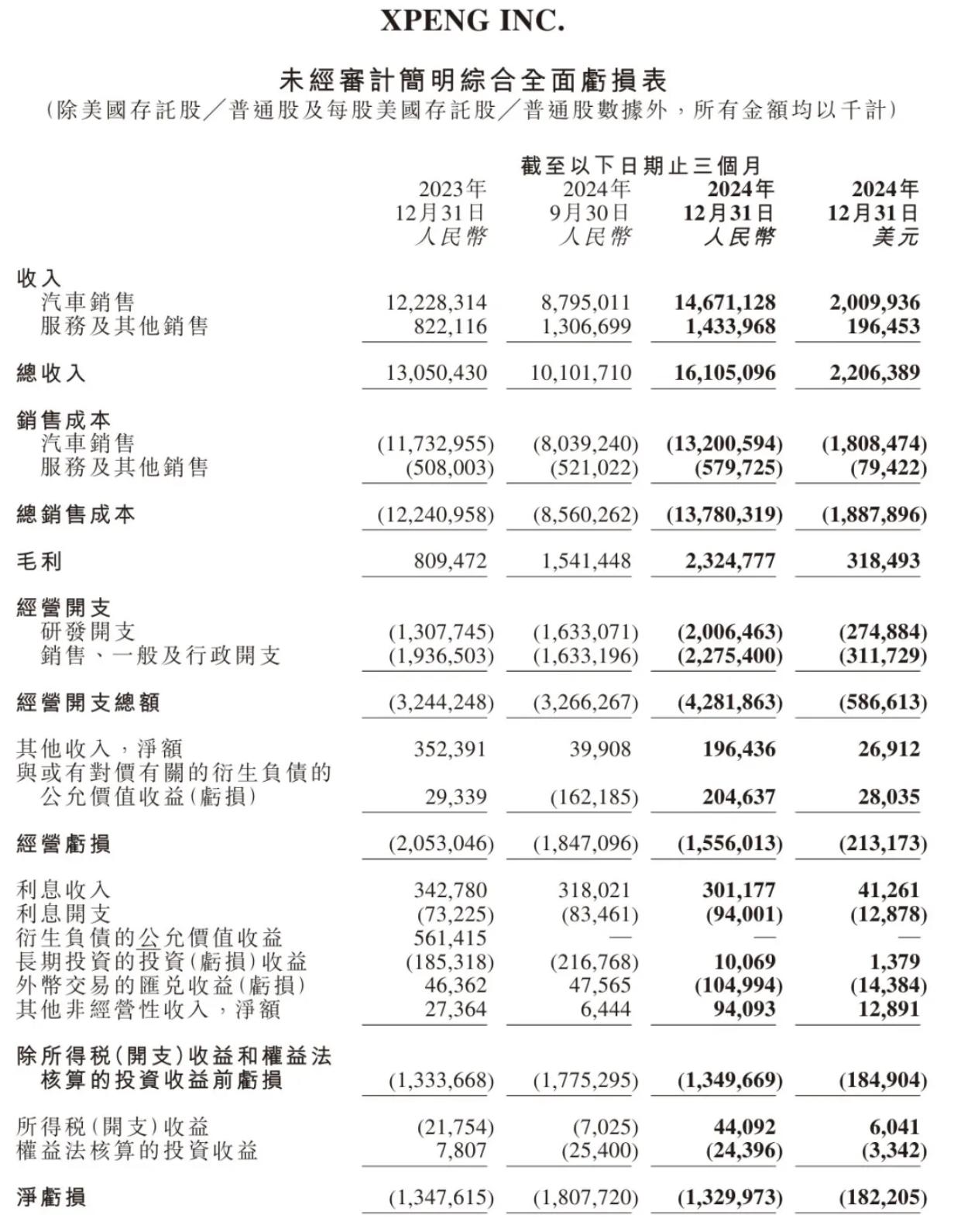小鹏汽车昨日发布财报。财报显示,小鹏汽车2024年营收为408.7亿元(56.0亿美元),较去年的306.8亿元增长33.2%;小鹏汽车2024年经营亏损为66.6亿元(9.1亿美元),上年为运营亏损108.9亿元;净亏损为57.9亿元(7.9亿美元),经调整净亏损为55.5亿元(7.6亿美元)。