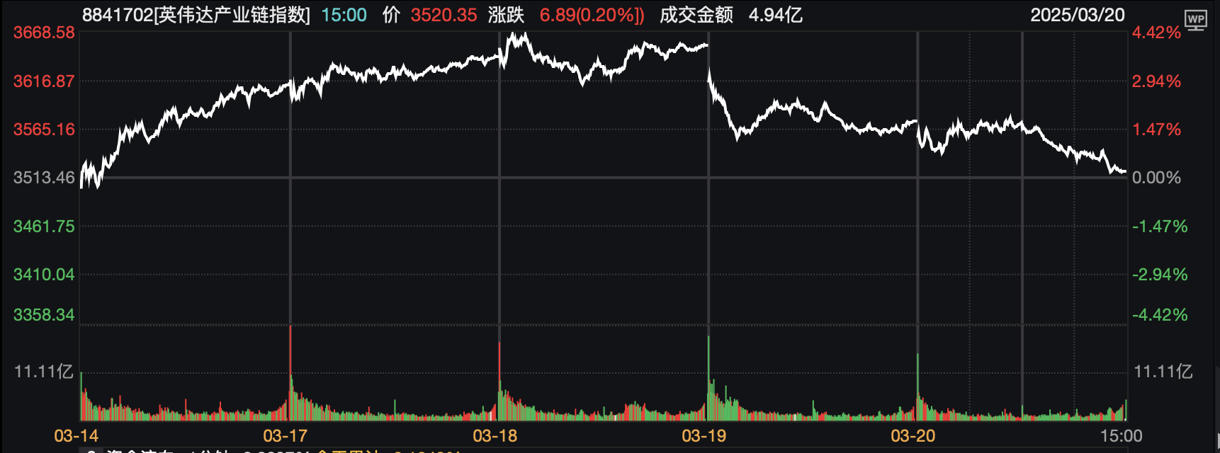 国内A股市场截至3月20日收盘,统计的“英伟达产业链指数”也已经连跌两天。