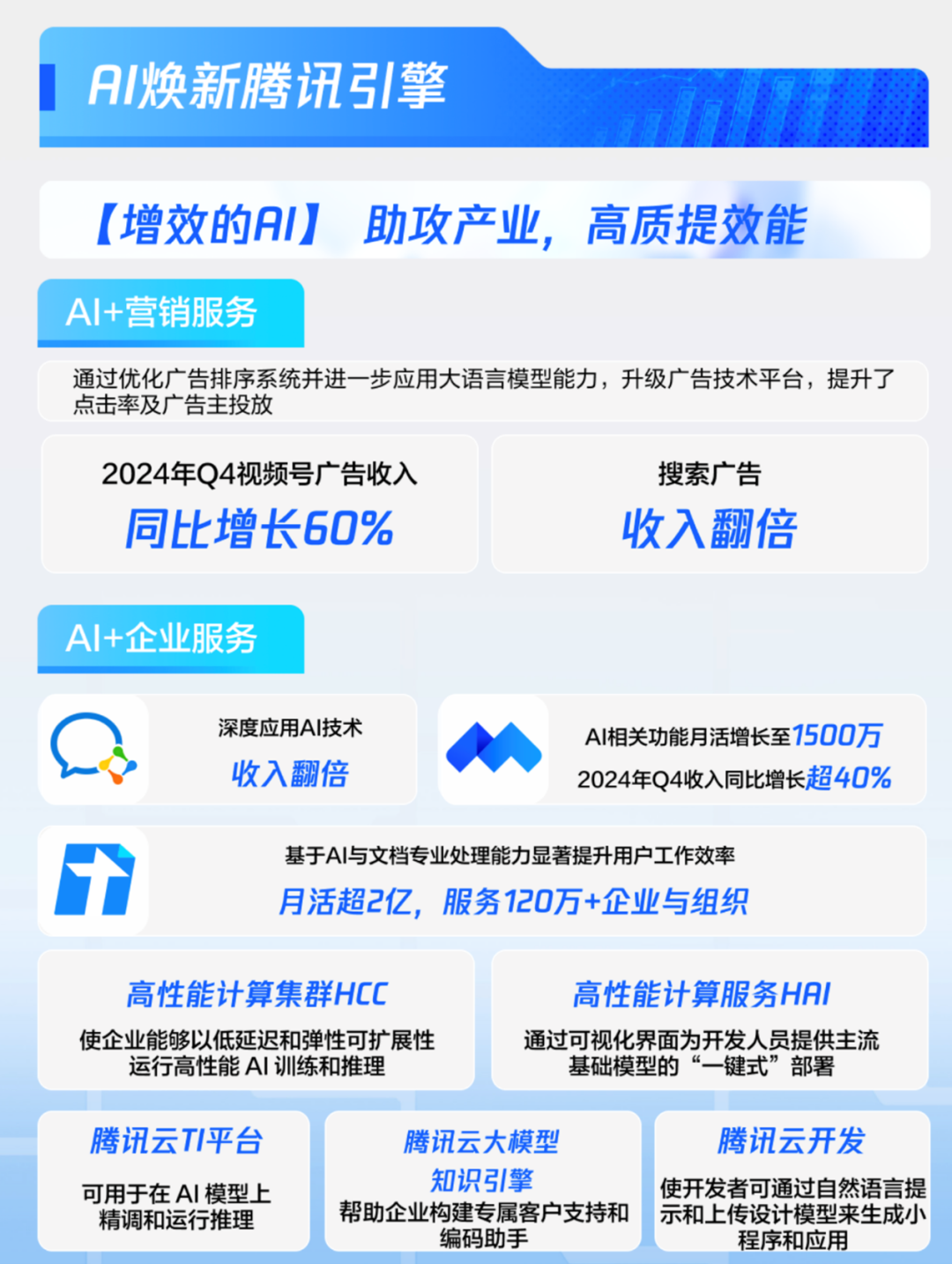 此外,他还特别谈到,虽然目前AI生态还处于早期阶段,但应用发展的机会已经到来,腾讯在2025年会继续加码AI方面的资本支出。