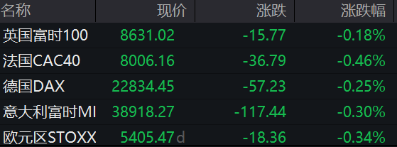 德国DAX指数涨0.25%,法国CAC40指数跌0.46%,英国富时100指数跌0.18%。