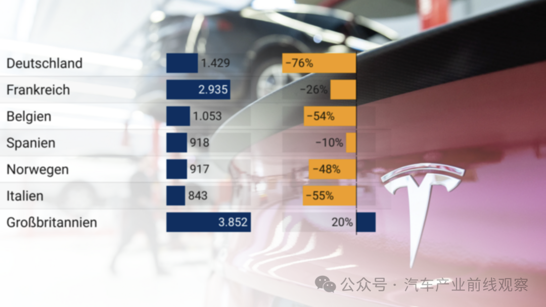 特斯拉在几乎所有重要的欧洲市场销量都出现了下滑:在法国下降了 26%,降至 2935 辆;在比利时下降了 54%,降至 1053 辆;在西班牙下降了 10%,降至 918 辆;在挪威下降了 48%,降至 917 辆;在意大利下降了 55%,降至 843 辆。只有在英国,特斯拉的销量增长了 20%,达到 3852 辆。