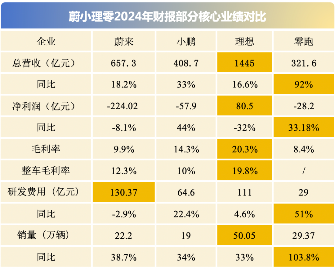 对比来看,初代造车新势力中,2024年理想汽车盈利80.5亿元,并且已经连续两年盈利;小鹏汽车亏损大幅收窄,从2023年同期的103.8亿元收窄至57.9亿元;零跑亏损28.2亿元,但已在第四季度实现利润转正,是第二家盈利的造车新势力。