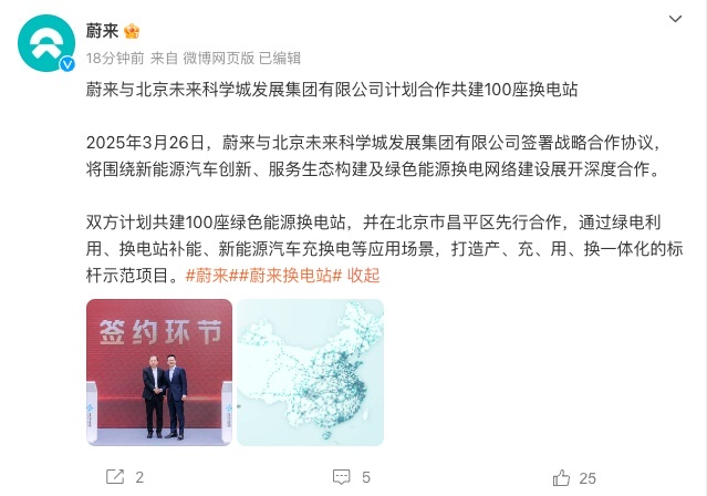 3月26日消息,蔚来汽车今日宣布,将与北京未来科学城发展集团有限公司计划合作共建100座换电站。
