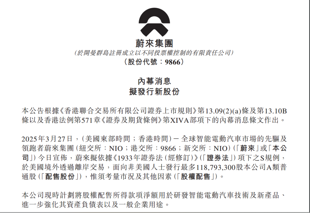3月27日,蔚来发布公告称,公司拟配售不超过1.19亿股A类普通股,募集净额用于研发智能电动汽车技术及新产品、进一步强化资产负债表和一般企业用途。