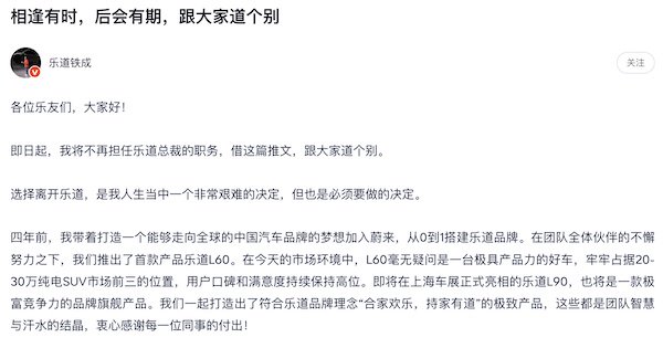 艾铁成在乐道App上表示,四年前,他从0到1搭建乐道品牌,并推出了首款产品乐道L60,第二款产品乐道L90也将在上海车展正式亮相。但是他也坦承,在过去的一段时间,乐道并未让这台竞争力极强的好车(乐道L60)达到与它的产品力相匹配的销量,在营销层面,有很多的欠缺和不足。