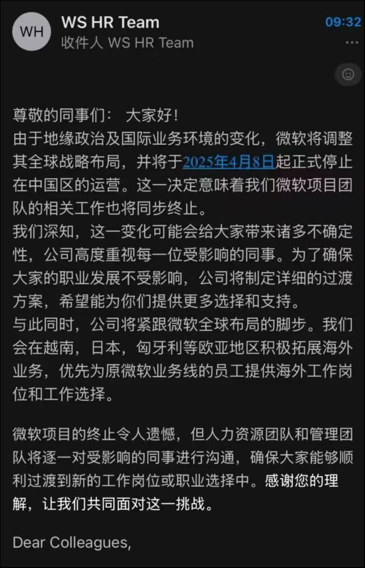 钛媒体消息,4月7日上午,一张显示“微软停止中国区运营”的邮件截图开始流传,该邮件内容称:由于地缘政治及国际业务环境的变化,微软将调整其全球战略布局,并将于2025年4月8日起正式停止在中国区的运营。这一决定意味着我们微软项目团队的相关工作也将同步终止。我们深知,这一变化可能会给大家带来诸多不确定性,公司高度重视每一位受影响的同事。为了确保大家的职业发展不受影响,公司将制定详细的过渡方案,希望能为你们提供更多选择和支持。与此同时,公司将紧跟微软全球布局的脚步。我们会在越南,日本,匈牙利等欧亚地区积极拓展海外业务,优先为原微软业务线的员工提供海外工作岗位和工作选择。
