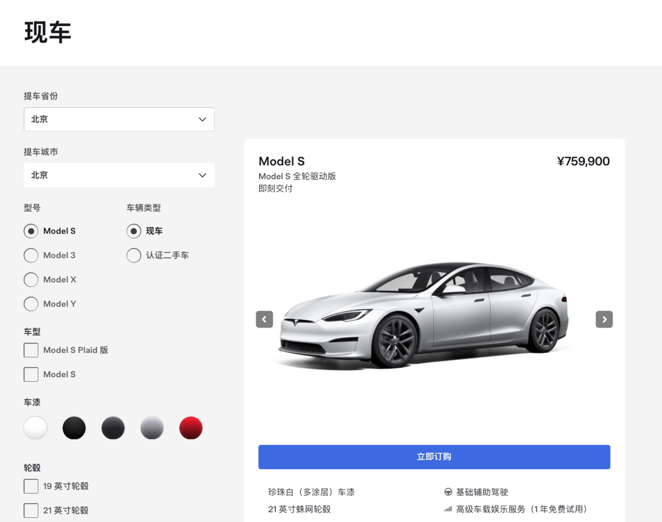 4月11日,基金君查询特斯拉中国官网发现,目前,Model S和Model X两款车型均已不再显示“订购新车”选项,消费者只能选择“了解”选项查看两款车的信息,而点击详情页查看后,仅有部分地区显示有现车可购买。