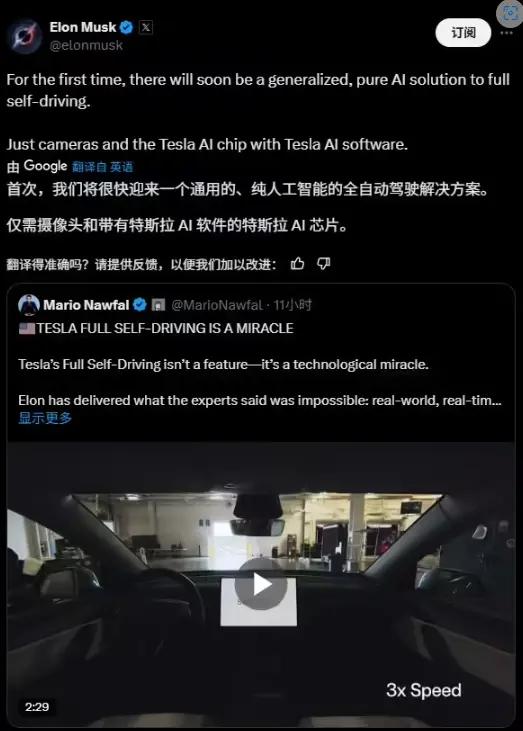 马斯克在推文中强调:“这是首次,全自动驾驶将很快迎来一个通用的、纯 AI 的解决方案。”据其描述,该技术将依托特斯拉自主研发的AI芯片及算法。这一技术路线与特斯拉自2016年起坚持的“视觉优先”战略一脉相承,但此前因多次安全事故陷入争议。行业数据显示,特斯拉FSD Beta版目前在美国的渗透率已超40万辆,但其安全评级仍落后于Waymo等采用激光雷达方案的竞争对手。