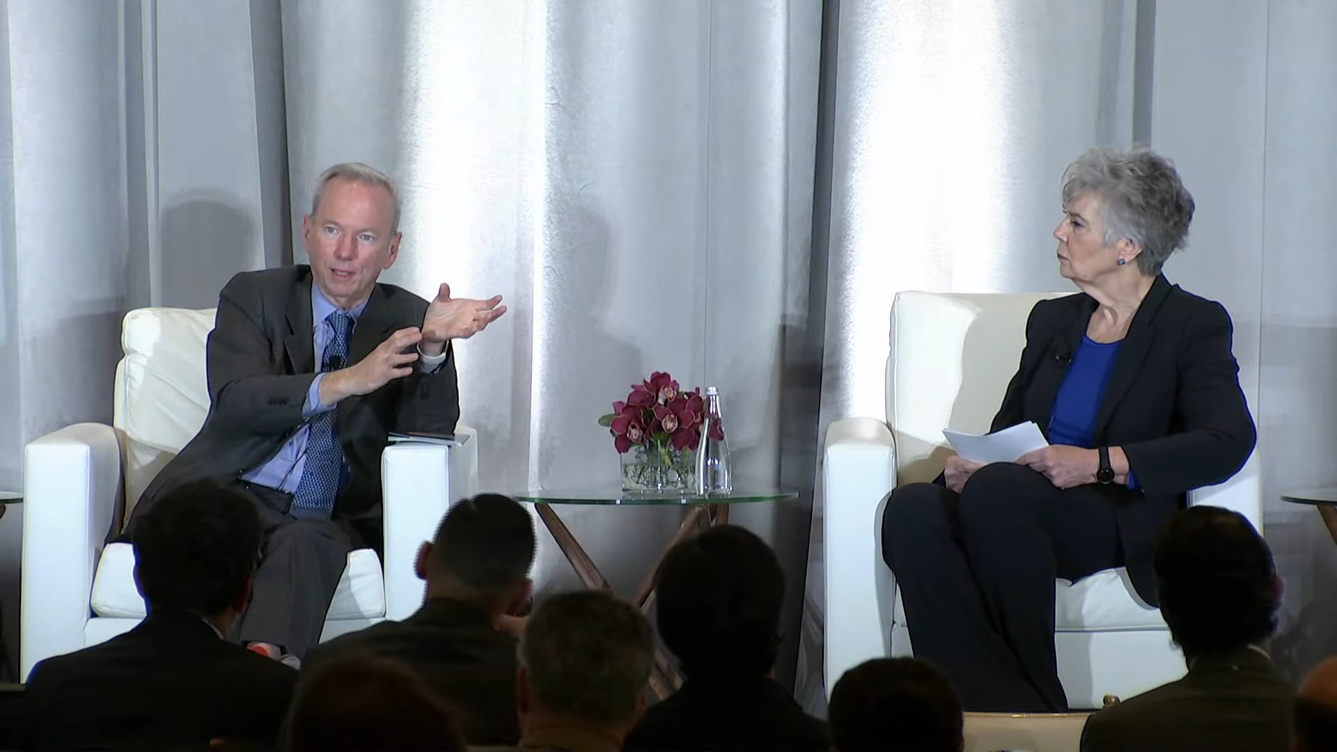 当地时间4月10日,施密特(左)在SCSP主办的“人工智能+生物技术峰会”上发言SCSP视频