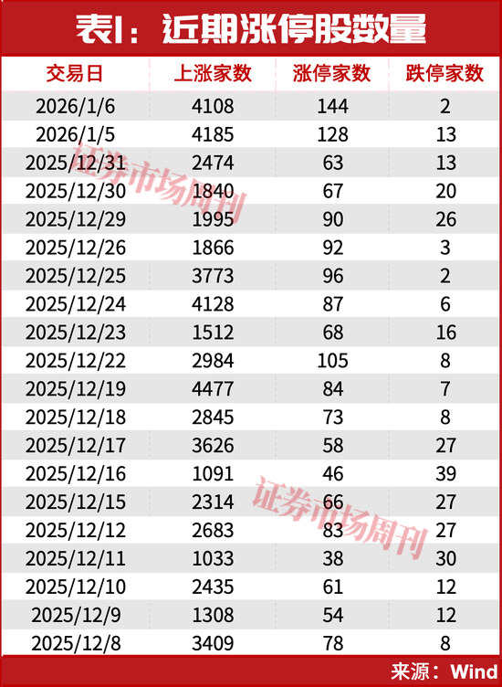 统计显示,A股近日涨停股数量屡超百家,如1月5日达到了128家,是此前一个交易日的2倍,1月6日则达到了144家,为近期最高值(见表1),且为2025年5月6日(145家涨停)以来的最高值。