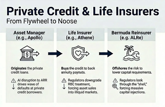这些损失冲击了那些旨在持有非流动性资产以应对长期债务的资产负债表。原本应该使系统保持韧性的“永久资本”并非某种抽象的、由耐心等待的机构资金和承担高风险的成熟投资者组成的资金池,而是美国家庭——“普通民众”——的储蓄,这些储蓄以年金的形式投资于如今违约的、由私募股权支持的软件和科技债券。而那些无法运转的被锁定资本则是人寿保险保单持有人的资金,而这方面的规则则略有不同。