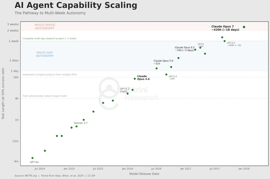 如今,人工智能代理可以处理长达数周的研发任务。指数级增长彻底颠覆了我们对可能性的认知,尽管沃顿商学院的教授们每年都试图用新的S型曲线拟合数据。