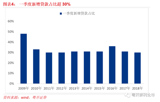 其二,银行一季度会有较强的放贷冲动。商业银行在早投放早受益的驱动下,一季度具有较强的放贷冲动,尤其是在经济下行,净息差下降的背景下,商业银行更有早放贷以锁定高息差的冲动。一季度新增人民币贷款占全年比重常年维持在30%以上,比如2009年一季度这一占比高达48%,可以说是2009年春季大行情及全年大牛市的导火索。