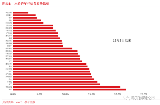 从本轮跨年行情的演进特征看,风格上基本采取了延续2019年下半年,以科技成长为主线的特征。从2019年12月2日至2020年1月9日,领涨的板块是传媒、电子和计算机,基本上是2019年下半年涨幅靠前的行业。
