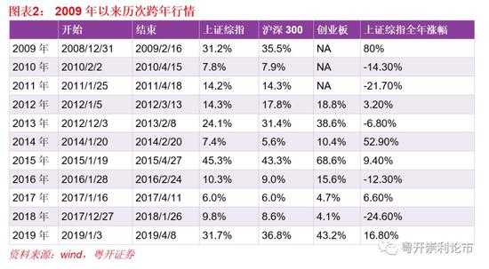 (1)跨年行情通常是介于1月初至4月之间的行情,行情持续时间通常为2个月左右,个别年份(比如2013年)行情会提前至12月。