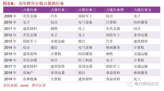 历史的经验告诉我们,历年的跨年行情占优的行业具有很大的差异,与特定时期的经济背景有一定关系。比如,在2009年、2011年和2012年的跨年行情中周期明显占优,这与“四万亿”刺激后,政策更多沿用老思路有一定关系;而2014年、2015年和2016年的跨年行情则是成长的表现更好,在供给侧改革下,政策告别的强刺激,新兴经济更受到市场青睐;2017年、2018年和2019年大消费则有不俗的表现,与外资不断流入且偏好大消费有关。