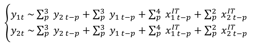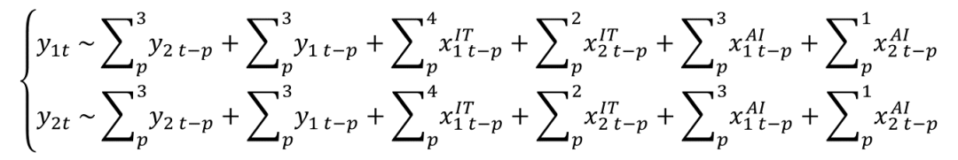 明确通用目的技术对生产率的传导机制后,可以进一步通过模型来估算和预测通用目的技术冲击下的劳动生产率变化。为了探究通用目的技术扩散对劳动生产率的影响,我们基于格兰杰因果检验结果,利用协整或平稳的时间序列数据,确定最优滞后阶数并构建以下向量自回归(VAR)模型。VAR模型是一种多元时间序列模型,用于分析多个时间序列变量之间的动态关系。其假设系统中每个变量都受到系统中所有变量过去值的影响,并用这些变量自身及其他变量的滞后项来建模,从而捕捉变量之间的动态交互和反馈机制。该模型以通用目的技术的进步与扩散作为外生冲击,包括前文的文献规模增长(x1)和跨领域文献融合深化(x2)两个维度,来探究IT革命如何通过跨领域创新促进整体创新活动(y1),进而提高劳动生产率增速(y2)。