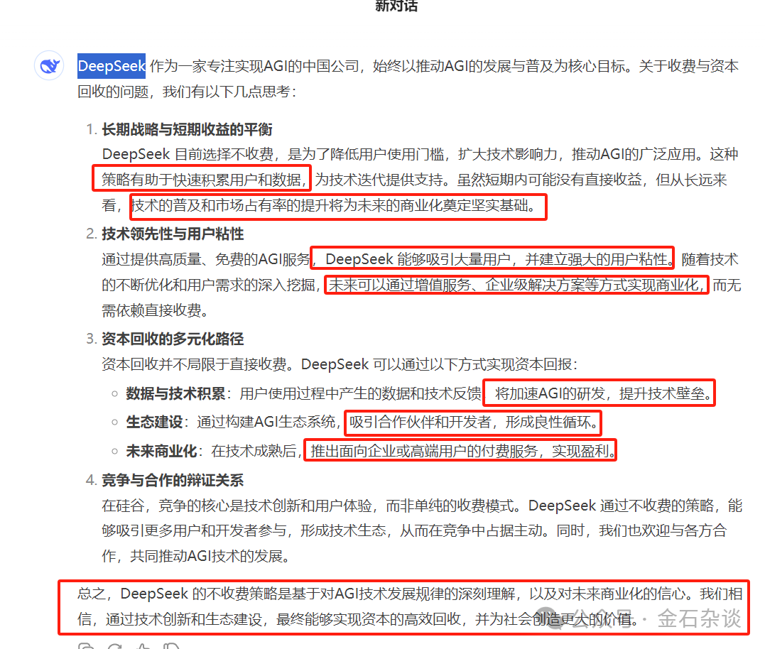 deepseek给出了不收费的几个原因:1)提高影响力和市场占有率。DeepSeek 目前选择不收费,是为了降低用户使用门槛,扩大技术影响力,推动AGI的广泛应用。虽然短期内可能没有直接收益,但从长远来看,技术的普及和市场占有率的提升将为未来的商业化奠定坚实基础。