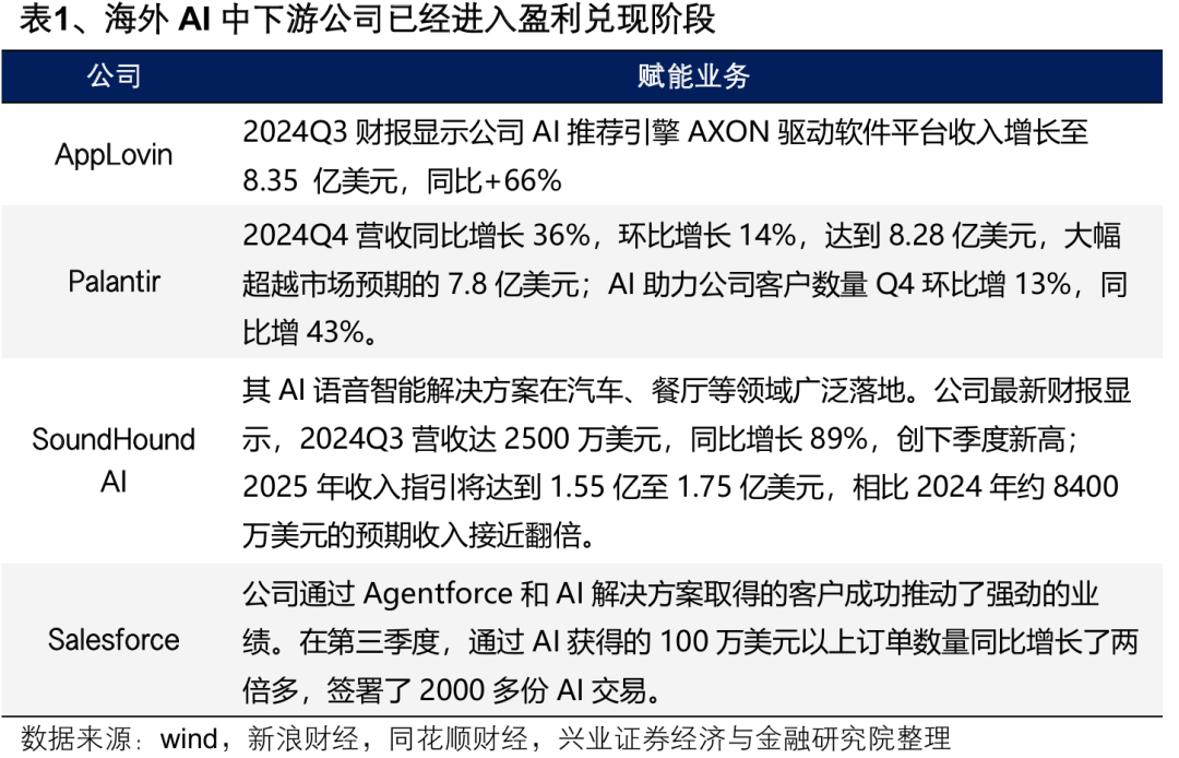 而自去年四季度以来,随着以AppLovin为代表的美股软件股业绩超预期,AI应用商业化得到初步验证,海外AI行情的交易主线已开始向中下游切换。随着AppLovin、Palantir、SoundHound AI、Salesforce等中下游公司的业绩开始兑现,盈利驱动下,海外AI行情已经率先向中下游的软件服务和应用端扩散,由此也带来了AI中下游相关公司的股价爆发式上涨。