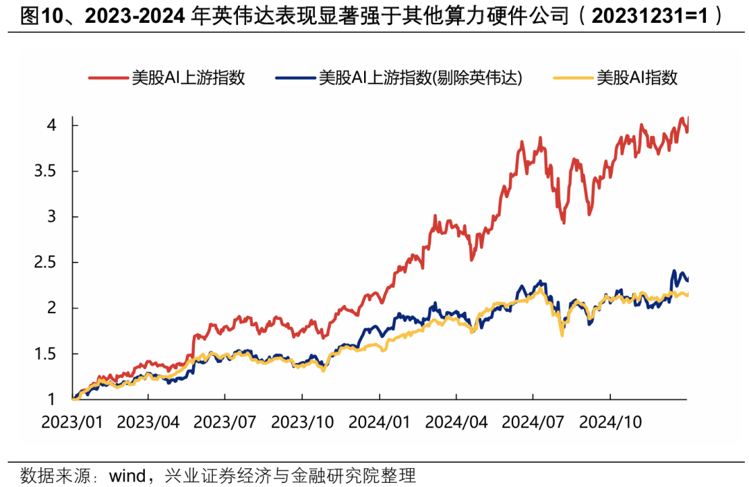 海外AI交易也呈现出类似的模式,在上游算力板块中,龙头公司英伟达显著优于其他公司。2023年以来,美股AI行情主要聚焦在上游算力端,而其中又以英伟达为核心,股价表现要显著优于其他上游公司。