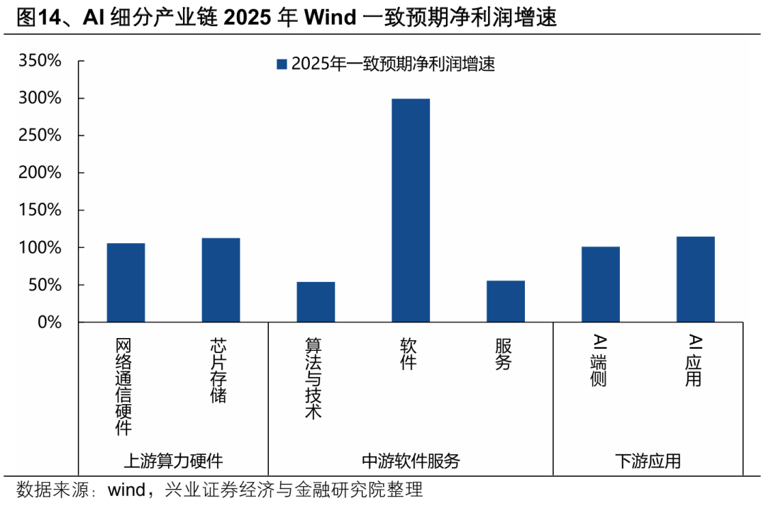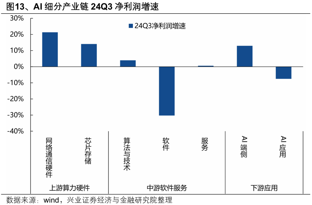 23年以来资金对上游算力的集中定价,核心源于确定性的业绩兑现带来的景气比较优势。从AI细分产业链24Q3净利润增速看,偏硬件的上游算力和下游端侧AI环节已经率先兑现业绩,而中游软件、下游AI应用等环节则尚未迎来困境反转。这背后,一方面是产业趋势演进下,产业链各环节先后受益的顺序差异;另一方面,中游软件、下游应用公司的业务整体具备较强的To-G、To-C属性,内需不足也在一定程度上对其景气有所拖累。