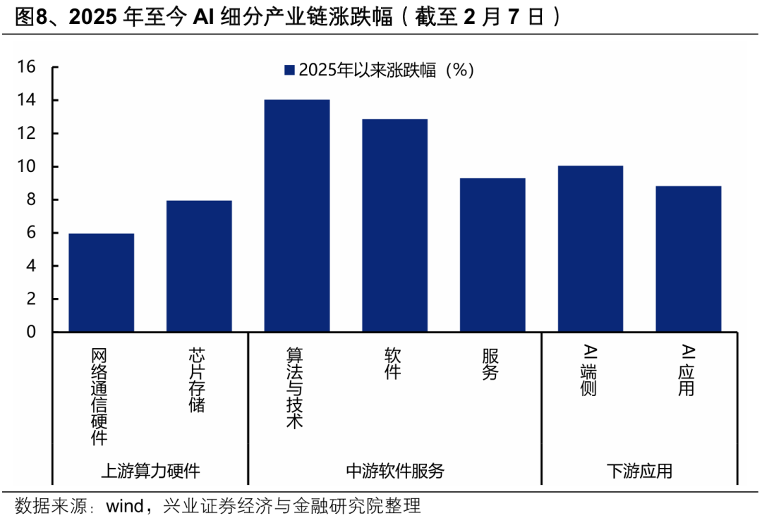 从产业链具体细分方向看,以芯片存储和网络通信硬件为代表的AI上游算力以及下游的端侧AI等硬件环节,机构持仓已处于历史较高分位水平,而中游算法与技术、软件和服务以及下游的应用持仓比例仍相对偏低。