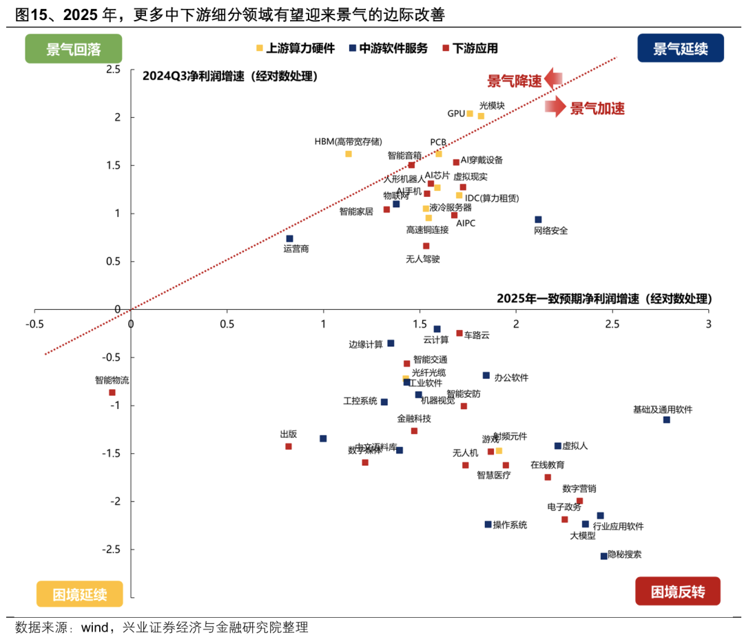 2025年,随着AI产业突破、内需复苏,不少中下游细分领域有望迎来景气的边际改善。部分上游算力环节经历前两年的景气高增后,市场对其后续的业绩容忍度有所降低,而随着AI产业突破、内需复苏,不少中下游领域在2025年有望进入困境反转或景气加速的阶段,资金有望加速定价其景气的边际改善。