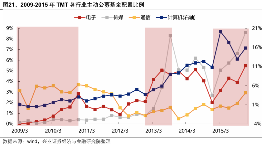 2009-2010年上游硬件占优的阶段,主动公募对电子的配置比例由2009Q3的0.36%提升至2010Q4的2.85%。