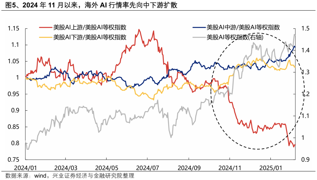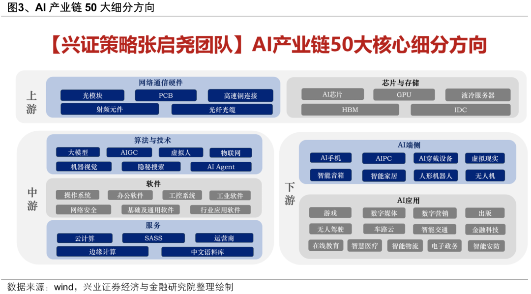 二、展望本轮AI行情三大趋势:从上游到中下游、从“集中”到“百花齐放”、从AI到AI+