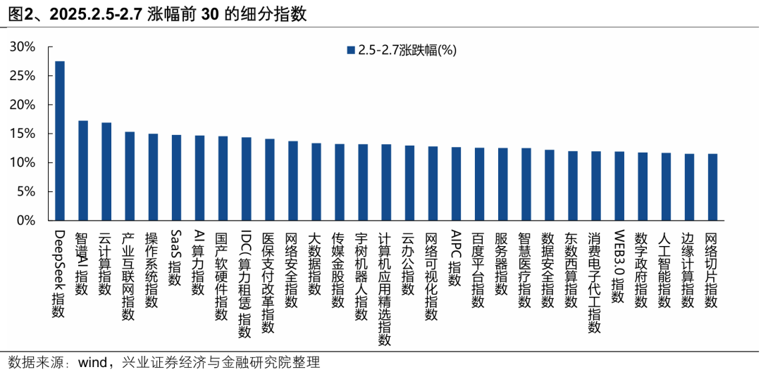 国产AI的实质性突破成为市场情绪的重要催化,节后市场以AI为核心开启了新一轮上行。中国本土研发的大模型DeepSeek R1横空出世,成功缩小了市场对于中美AI发展前景的认知差异,引发了中国AI产业链的价值重估。而国产AI的突破性进展也成为节后市场情绪的重要催化,以AI为代表的科技板块引领市场开启了新一轮上涨。