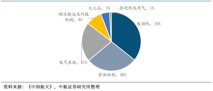 建议关注参与火箭核心环节或分系统的企业。根据美国ULA公司旗(金麒麟分析师)下最具竞争力的运载火箭——宇宙神5系列运载火箭的成本构成(如下图所示),火箭发动机成本占比达到36%。发动机是运载火箭硬件成本的主要构成,特别是液体火箭发动机。目前,我国除了整箭企业参与液体火箭发动机的研制外,也有部分民营企业专注于液体火箭发动机的研制和销售。除了火箭发动机外,推进剂贮箱也是液体运载火箭的核心部件之一,占据箭体结构体积的80%和重量的60%以上,是火箭必需的消耗品,其成本约占整箭成本的25%左右。火箭贮箱是一个工艺过程复杂、技术和工程门槛高、技术和人才稀缺的领域,值得重点关注。