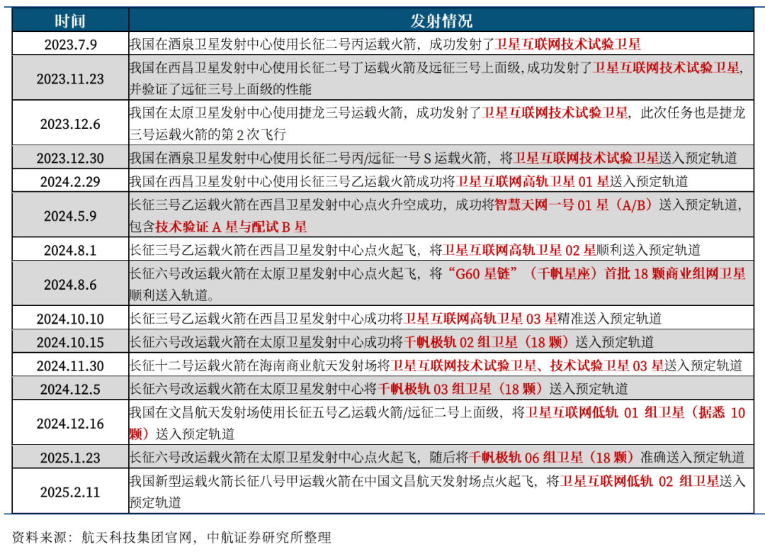 表4 近年我国中低轨卫星互联网卫星近期发射情况(截至2025年2月13日)