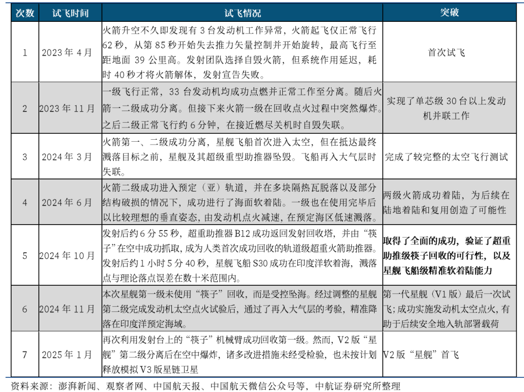 表9 星舰历次试飞情况