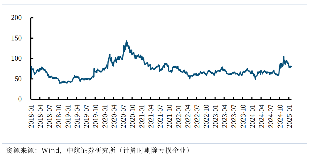 我们对中航证券商业航天行业指数标的进行PE(TTM)统计,截至2025年1月末,指数市盈率为79.94倍,较11月底下降4.74,处于2018年以来的76.11%分位,整体估值水平有所回落,但依旧维持在历史较高水平。