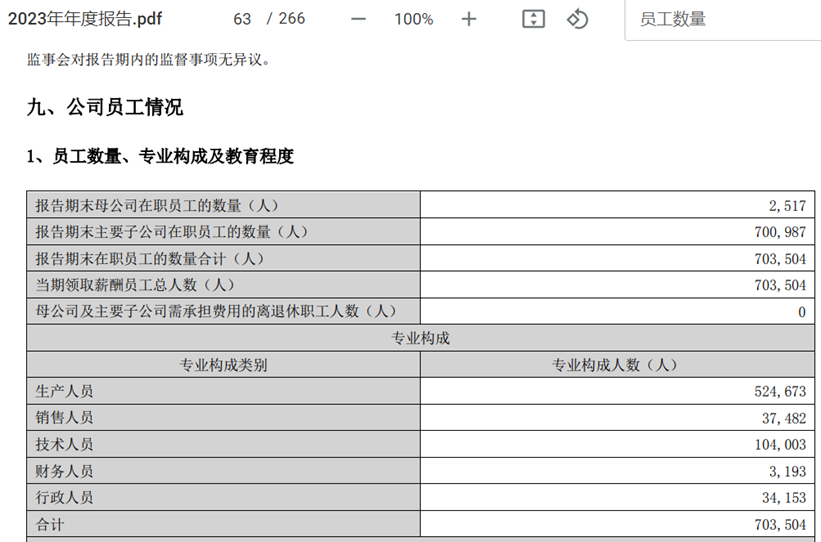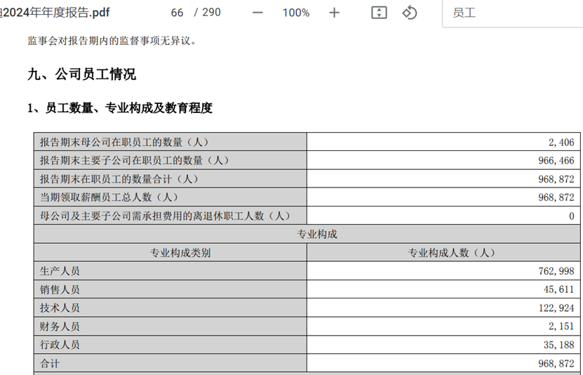 再来看人员的变动,也挺有意思,2024年末迪王的员工总数为96.65万人,相比2023年末的80.1万人,增加了近40%,这也是公司经营规模大幅增长的依托。从不同岗位结构来看,生产人员从52.47万人增加到了76.3万人,增幅将近50%,是增幅最大的;技术人员从10.4万人增加到12.29万人,增幅不到20%,落后于平均增幅。