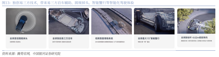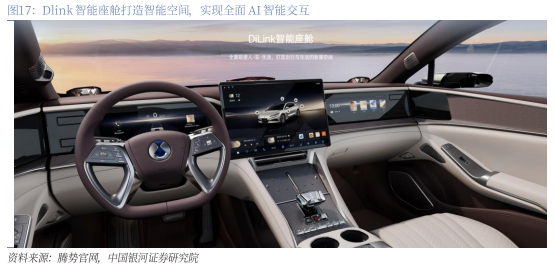智能座舱:Dlink智能座舱打造智能空间,实现全面AI智能交互。腾势品牌沿用公司Dlink智能座舱,采用4nm旗舰座舱芯片,接入满血DeepSeek,实现全面AI智能交互,另外在硬件层面采用较高配置,如腾势Z9GT全球首搭十屏互联(13.2英寸仪表盘、17.3英寸中控生态屏、13.2英寸副驾娱乐屏、50英寸AR-HUD、后排液晶空调控制面板、流媒体内后视镜屏、流媒体外后视镜屏*2、前&后冰箱屏),软件层面还能够实现手车互联、无麦K歌、AI绘画、多车畅联等功能,软硬件配置较为齐全。