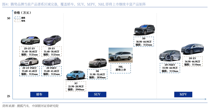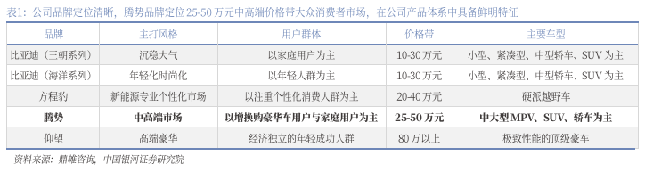 公司品牌定位清晰,腾势品牌定位25-50万元中高端价格带大众消费者市场,在公司产品体系中具备鲜明特征。公司旗下拥有王朝、海洋、方程豹、腾势、仰望五大品牌,各品牌定位与价格带区分清晰,其中腾势品牌定位25-50万元中高端价格带的大众消费市场,价格带方面与王朝、海洋、仰望形成区隔,产品重合度较低,产品风格与方程豹形成明显区隔,腾势品牌在公司产品体系内定位清晰,具有鲜明特征,使得公司可以精准赋能,避免内部产品体系“左右手互博”。