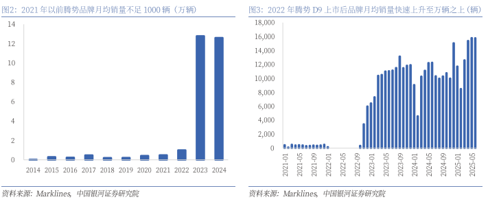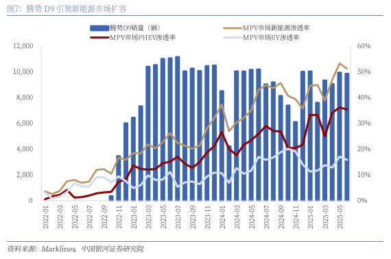D9是腾势品牌明星产品,贡献腾势品牌销量的主要部分。自上市以来,D9始终是腾势品牌的明星产品,2024年腾势D9销售10.3万辆,占腾势品牌总销量的81.7%,其中PHEV版销售9.8万辆,2025年H1腾势D9销售5.6万辆,占腾势品牌总销量的69.9%,其中PHEV版销售5.0万辆。