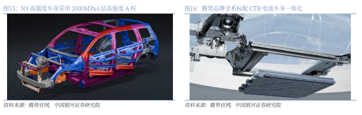 采用高强度车身与CTB电池车身一体化技术,提升产品被动安全属性。腾势品牌在车辆被动安全上采用了高强度的车身架构,N9采用2000MPA4层高强度A柱,Z9GT整车高强度钢与铝合金占比达91.5%,车身最高强度超过40400MPa。电池结构上全系标配CTB电池车身一体化,提升扭转刚度,正碰侵入降低15%,侧柱碰侵入降低32%。